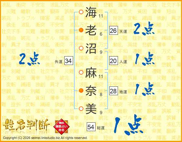 海(11画)老(6画)沼(9画) 麻(11画)奈(8画)美(9画)