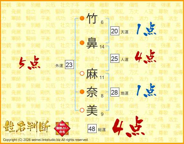 竹(6画)鼻(14画) 麻(11画)奈(8画)美(9画)