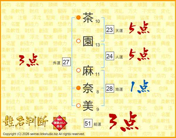 茶(10画)園(13画) 麻(11画)奈(8画)美(9画)