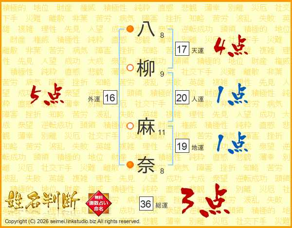 八柳麻奈さんの総運は36画の3点!