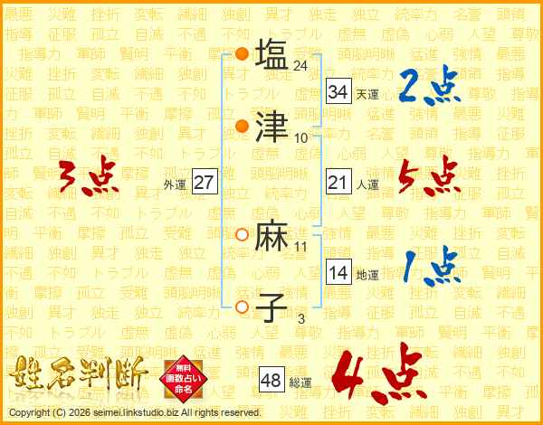 あなたの人生を表す1番重要な運勢です。生涯を通じて影響する総合運となり、主に50歳以降の晩年期に影響を及ぼします。苗字と名前の合計画数。