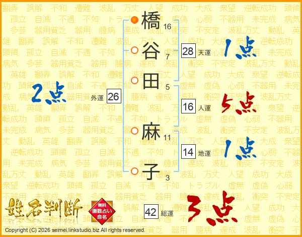 橋(16画)谷(7画)田(5画) 麻(11画)子(3画)