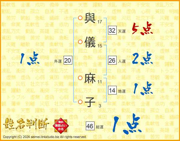 生活面を象徴する運勢です。外部から受ける影響力を表し、結婚運、家庭運や職場、環境への順応性を表します。総運から人運を引いた画数。姓や名が1文字の場合を除く。