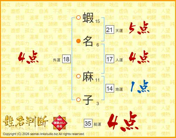 蝦(15画)名(6画) 麻(11画)子(3画)