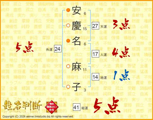 安(6画)慶(15画)名(6画) 麻(11画)子(3画)