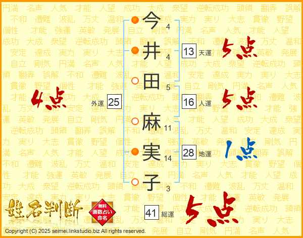 今(4画)井(4画)田(5画) 麻(11画)実(14画)子(3画)