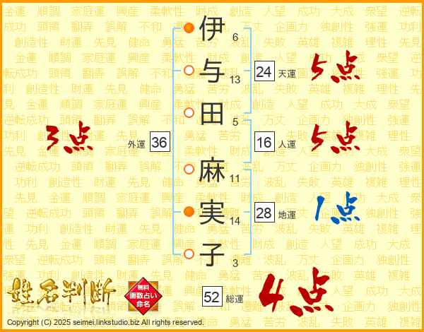 伊(6画)与(13画)田(5画) 麻(11画)実(14画)子(3画)