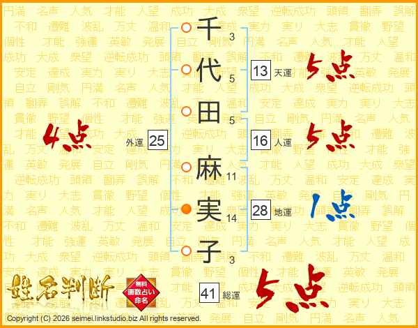 千(3画)代(5画)田(5画) 麻(11画)実(14画)子(3画)