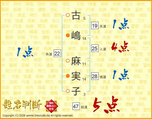 古(5画)嶋(14画) 麻(11画)実(14画)子(3画)
