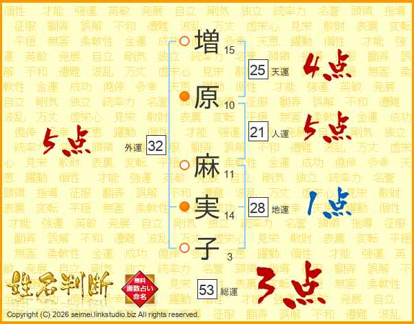 増(15画)原(10画) 麻(11画)実(14画)子(3画)