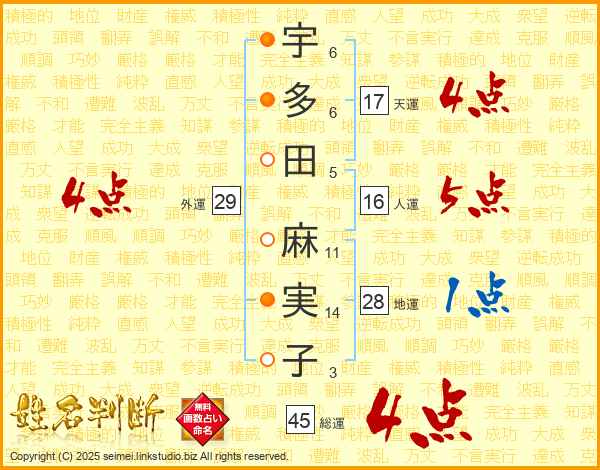 宇(6画)多(6画)田(5画) 麻(11画)実(14画)子(3画)