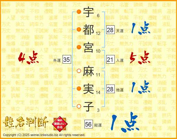宇(6画)都(12画)宮(10画) 麻(11画)実(14画)子(3画)