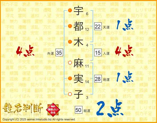 宇(6画)都(12画)木(4画) 麻(11画)実(14画)子(3画)