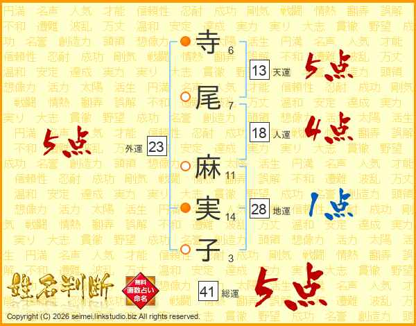 寺(6画)尾(7画) 麻(11画)実(14画)子(3画)