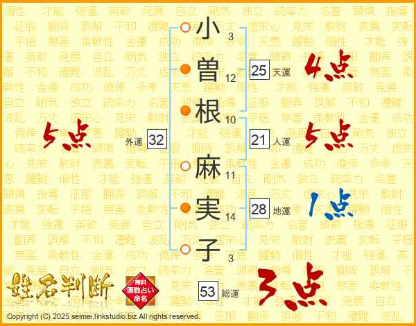 小(3画)曽(12画)根(10画) 麻(11画)実(14画)子(3画)