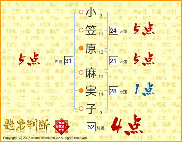 小(3画)笠(11画)原(10画) 麻(11画)実(14画)子(3画)