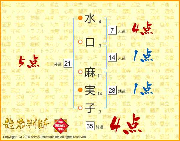 水(4画)口(3画) 麻(11画)実(14画)子(3画)