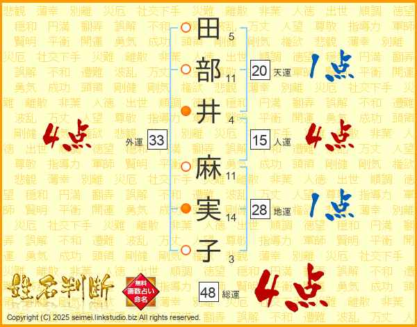 田(5画)部(11画)井(4画) 麻(11画)実(14画)子(3画)