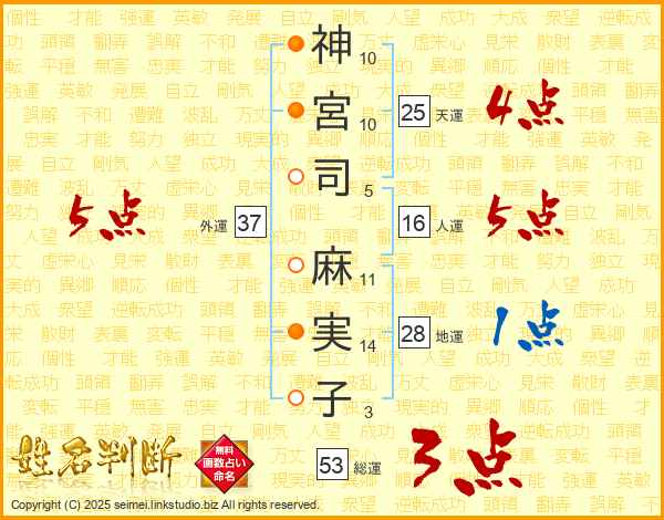神(10画)宮(10画)司(5画) 麻(11画)実(14画)子(3画)