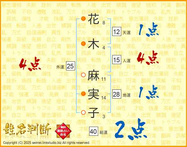 花(8画)木(4画) 麻(11画)実(14画)子(3画)