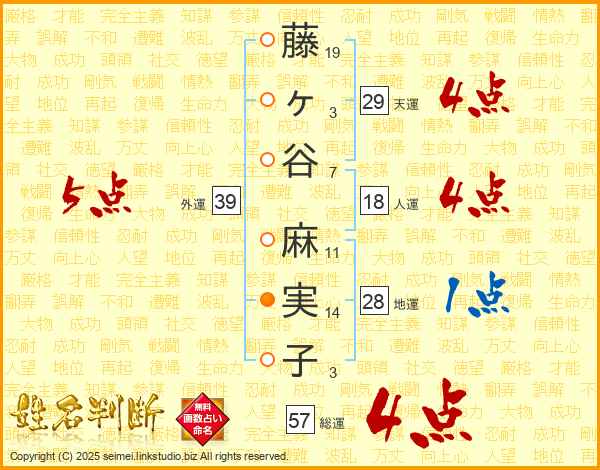 藤ヶ谷麻実子さんの総運は57画の4点!