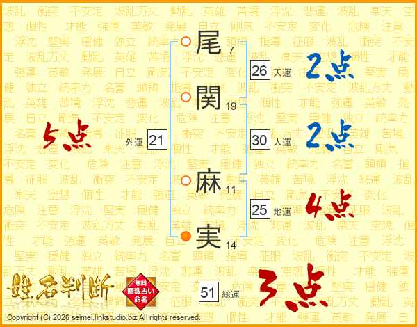 生活面を象徴する運勢です。外部から受ける影響力を表し、結婚運、家庭運や職場、環境への順応性を表します。総運から人運を引いた画数。姓や名が1文字の場合を除く。