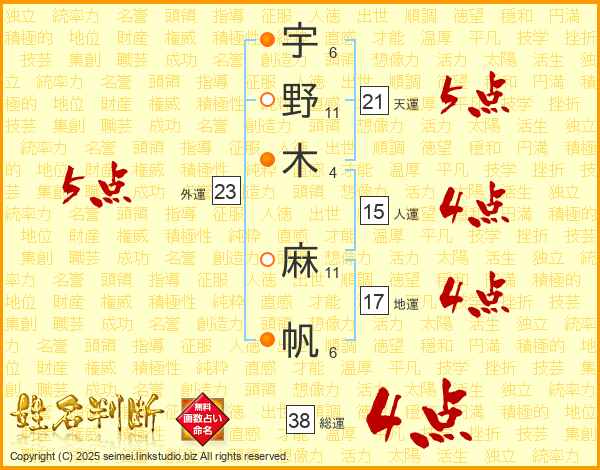 宇(6画)野(11画)木(4画) 麻(11画)帆(6画)