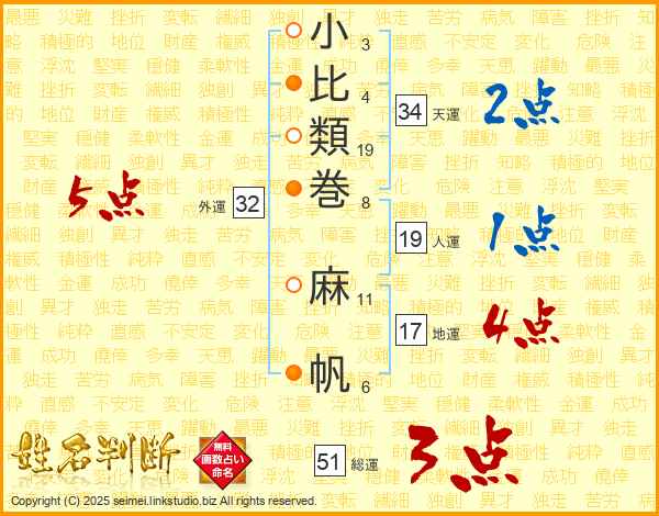 小(3画)比(4画)類(19画)巻(8画) 麻(11画)帆(6画)