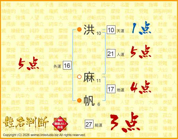 あなたの人生を表す1番重要な運勢です。生涯を通じて影響する総合運となり、主に50歳以降の晩年期に影響を及ぼします。苗字と名前の合計画数。