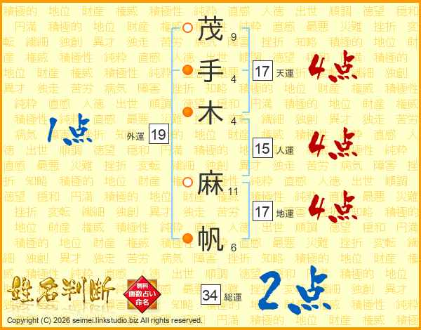茂(9画)手(4画)木(4画) 麻(11画)帆(6画)