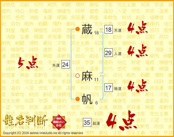 蔵(18画) 麻(11画)帆(6画)