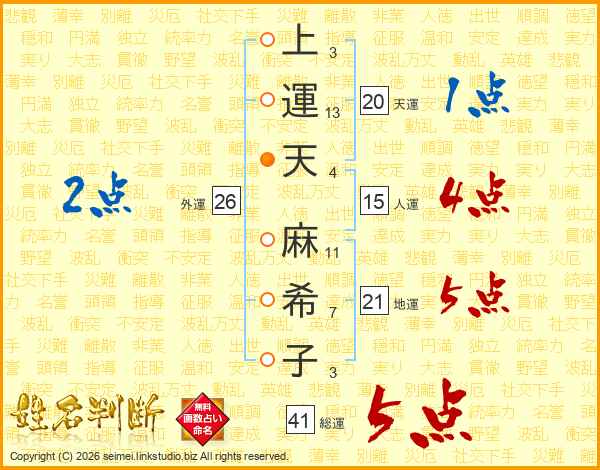 上(3画)運(13画)天(4画) 麻(11画)希(7画)子(3画)