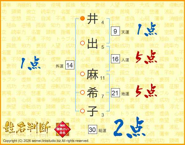 井(4画)出(5画) 麻(11画)希(7画)子(3画)