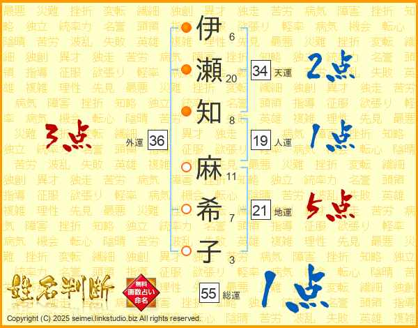 伊(6画)瀬(20画)知(8画) 麻(11画)希(7画)子(3画)