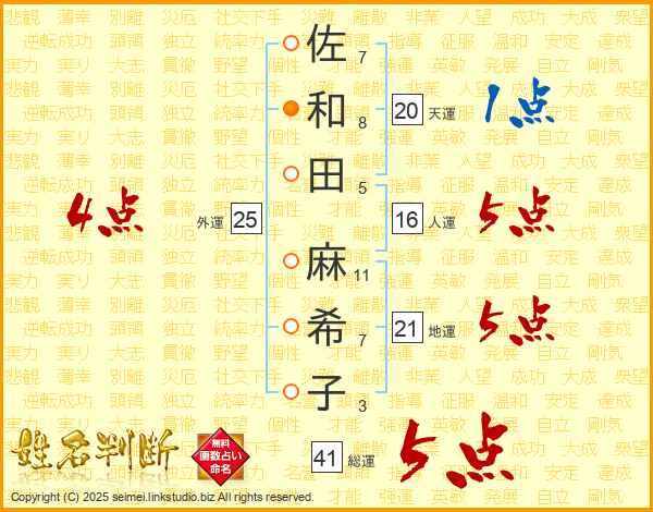 佐(7画)和(8画)田(5画) 麻(11画)希(7画)子(3画)