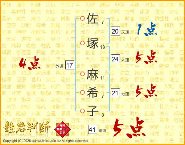 佐塚麻希子さんの総運は41画の5点!