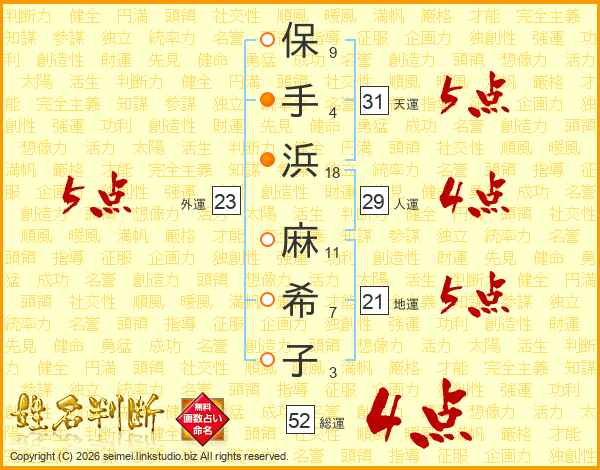 保(9画)手(4画)浜(18画) 麻(11画)希(7画)子(3画)