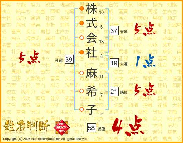 株式会社麻希子さんの総運は58画の4点!