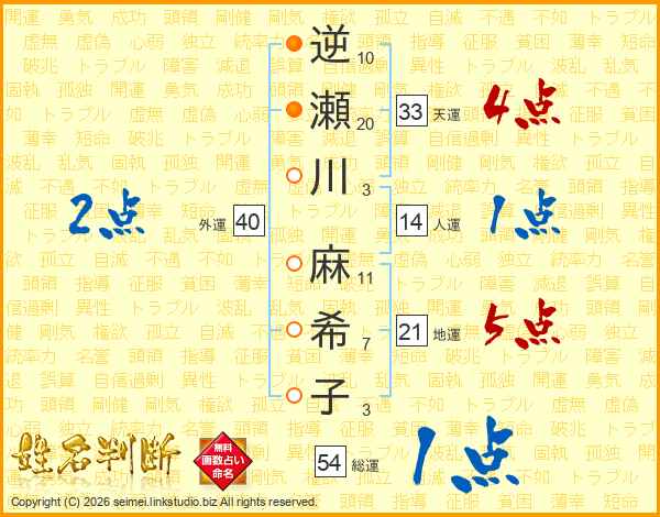 逆(10画)瀬(20画)川(3画) 麻(11画)希(7画)子(3画)