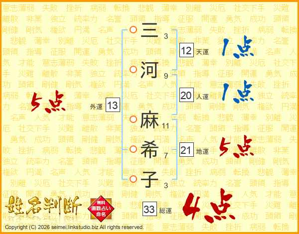 三(3画)河(9画) 麻(11画)希(7画)子(3画)