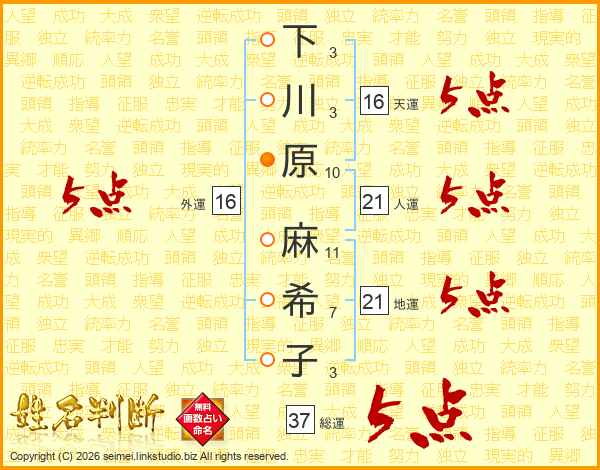 下(3画)川(3画)原(10画) 麻(11画)希(7画)子(3画)