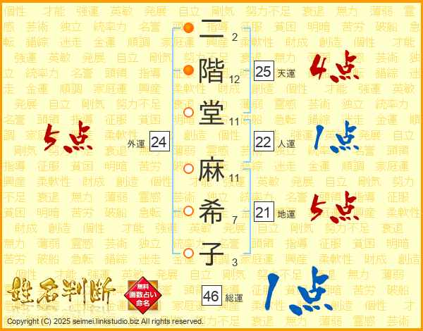 二(2画)階(12画)堂(11画) 麻(11画)希(7画)子(3画)