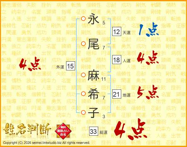 永尾麻希子さんの総運は33画の4点!