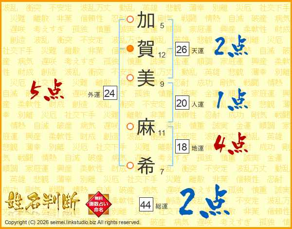 加(5画)賀(12画)美(9画) 麻(11画)希(7画)