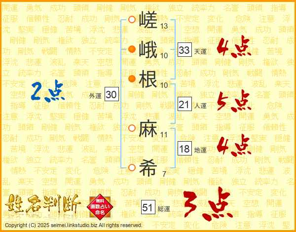 嵯(13画)峨(10画)根(10画) 麻(11画)希(7画)