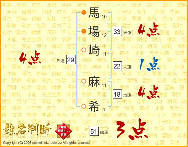 馬(10画)場(12画)崎(11画) 麻(11画)希(7画)