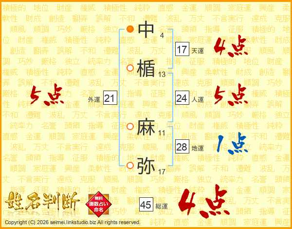 中楯麻弥さんの総運は45画の4点!