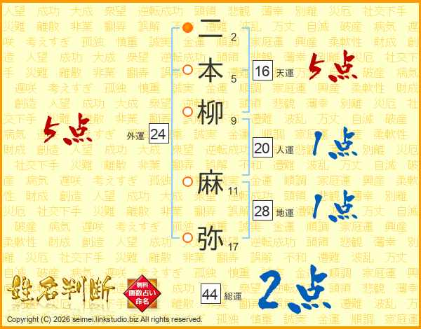 二(2画)本(5画)柳(9画) 麻(11画)弥(17画)