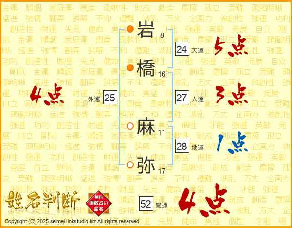 岩(8画)橋(16画) 麻(11画)弥(17画)
