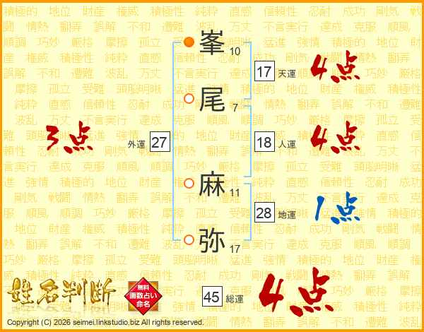 峯(10画)尾(7画) 麻(11画)弥(17画)